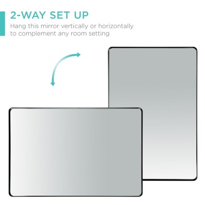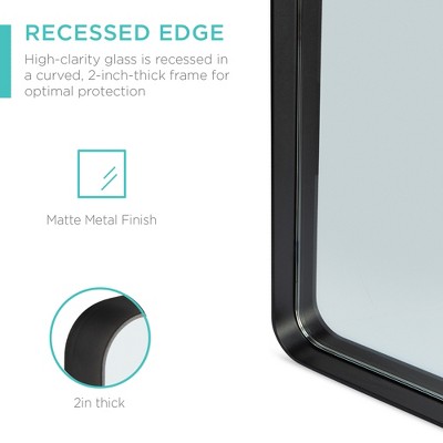 Put on your best look! High-clarity glass is recessed in a curved, 2-inch-thick frame for optimal protection. Perfect for the bathroom, entryway, or as a decorative piece in any other room, this rectangular mirror adds versatility to your home setup with a matte metal finish. Hang this mirror vertically or horizontally to complement any room setting. Designed with safety in mind; anti-blast film sticks to the glass to help prevent shattered pieces from leaving the frame, while a thick metal frame adds to the durability and safety-first design for years of enjoyment. Easily install this mirror in 15 minutes with a simple, 1-person assembly process and included hardware.