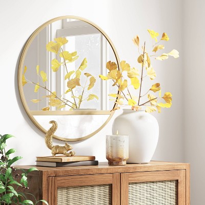 The Round Wall Mirror from Threshold™ will hang beautifully in any room. This round decorative mirror is enclosed in a sleek metal frame in a gold brass tone for a touch of glam shine, and is accented with a small crescent insert in white marble at the bottom for an artful look. With its striking beauty, this accent mirror brings a room to life and helps brighten up your area by allowing light to bounce around wherever you hang it.