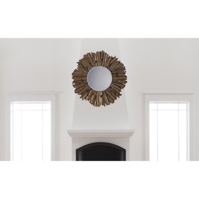 The decorative hand forged and hand hammered metal frame has an antiqued gold leaf finish with burnished edges and a light gray wash. Mirror has a generous 1 1/4″ bevel.|Contemporary|Industrial|Modern|Transitional||Gold|metal, antiqued gold leaf, burnished
