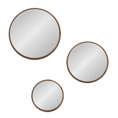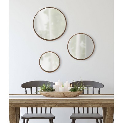 is set of three hanging mirrors will introduce a sophisticated flair to your contemporary home dΓ©cor. Each mirror in the set is a different size and when displayed together, create a beautiful collection on your wall. Individual mirrors are unique enough to hang on their own for a lovely look too. The outside diameter of the largest mirror is 22-inches followed by the medium size mirror which is 17.75-inches round, and the smallest mirror is 14-inches round.