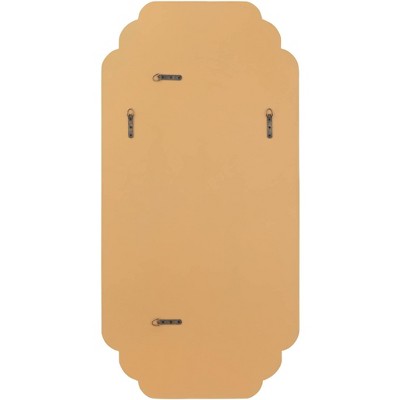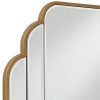 - Matte brush gold finish over MDF wood frame. Scalloped edge details. Beveled glass.