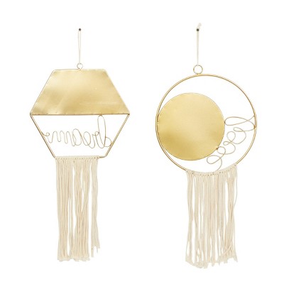 - This stylish set of hanging wall mirrors come with gold metal frames and soft white cotton strings