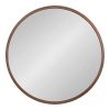 The Travis decorative wood mirror is a beautifully unique accent piece to add to your home decor. It features an elegant round shape and a robust wooden frame to create an eye-catching conversation piece for any room. Hang this mirror above a fireplace, over a sofa, or above your bedroom headboard for a stunning wall display. This mirror is also stunning as a vanity mirror in a master bath or powder room! The reflective mirror surface has a 20.5-inch diameter, and the outer dimensions include a 21.6-inch diameter and 1.5-inch depth from the wall. Adding a mirror to your home emphasizes its light sources and makes the space appear dimensional and vibrant. The mirror weighs 6 pounds, making it easy to move from room to room. Two metal D-ring hangers are attached to the back of the frame with a wire for easy wall display. This gorgeous wood contemporary modern wall mirror piece will be the perfect fit in your existing decor theme in any room of the home!