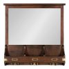 This organizational board combines rustic chic home dΓ©cor with functionality. The outer dimensions measure 24 inches across and 24 inches high with a depth of 3.5 inches. The decorative board contains a 20.25 inch by 14.25 inch mirror to check you appearance one final time before leaving the house. (You look great!) The board also has three double metal hooks so your days of searching for your keys are over! The hooks are sturdy enough for full key chains or other odds and ends that you would like to hang. Also included are three pockets 7 inches across with a 1.5 inch lip to store your important mail, bills, dog leashes, or other accessories off of the top of your counter. The cubbies have metal label holders which you can customize however you would like. This functional board has sturdy wood construction with a rustic finish and two keyhole hangers on the back for easy display. This multi-functional wall hanging board is the perfect tool to organize to your office, kitchen, or entryway.