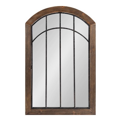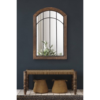 The Haldron wood arch mirror embodies the casual feel of a timeless aesthetic. Our version of this traditional-style mirror includes a natural iron fretwork, and a wide wood profile finished in a rustic brown finish. It will provide radiance while balancing a roomβs ambiance. The mirror’s internal metal fretwork is an impressive detail inspired by a classical window design. It features a textured rustic finish that adds a dramatic touch to the interior metal design and mirror underneath. This decorative piece is a great addition to your traditional-themed rooms. It comes with metal D-ring hangers attached to the back for easy wall mounting. This wall mirror is ideal for above a sofa, over a mantle, or any wall space that needs brightening and interest. In entryways, bedrooms, or hallways, this arched mirror will create a stunning reflective window wall. The outer display dimensions are 24 inches across by 36 inches high. Give your living spaces a visual makeover while illuminating the area with this beautiful arch mirror.