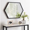Add an element of light and dimension to your home with the Laverty Modern Mirror. The trendy hexagon shape and black frame create a minimalist design capable of thriving in any living space. Adding a mirror to your home decor opens up narrower spaces by reflecting light sources and spreading them across the room. The Laverty Mirror stands at 22 inches wide by 31 inches high, making it an excellent medium-sized mirror to use as a double vanity in your master bathroom. It also pairs well with the Laverty Magnetic Chalkboard or Laverty Pinboard, providing an eye-catching, symmetrical wall display when hung side by side. Create a makeup and styling area in your bedroom by hanging it vertically, or hang it horizontally over a console table in your entryway. It only takes a matter of seconds to mount thanks to its lightweight frame and metal D-ring hangers pre-installed on the back. No matter how you choose to display this mirror, it’s sure to dazzle all of your guests with its clean, modern design and trendy geometric shape.