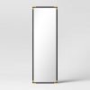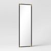 The Metal Floor Mirror with Corner Detail from Threshold™ is a must-have accessory in your home that performs aesthetic and practical functions simultaneously. This floor mirror has a timeless rectangular silhouette, and is enclosed in a wood-finish frame in weathered black that’s gleaming with ornate detailing in gold tone on all four corners for a touch of striking glamor. This decorative mirror makes a wonderful addition to any space — hang it on a wall in the bedroom for an immediate dressing area, in the hallway to make it look longer and more expansive or tuck it behind plants or a sofa to open up a small space.