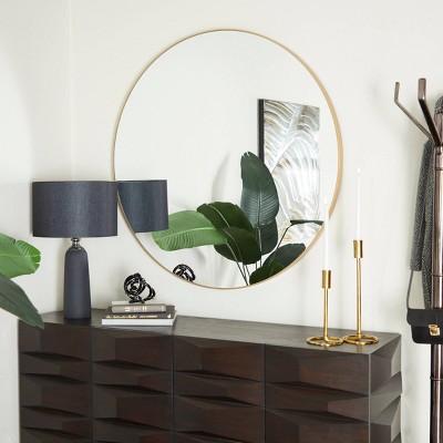- A round shaped wall decor showcases brilliantly reflective mirror with a slim and sleek gold frame for luxurious appeal