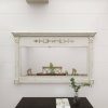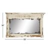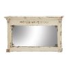 - Eggshell white mirror with heavy distressing, rectangular shape with top shelf, similar to a mantle, intricate acanthus and antefix carvings for a vintage look