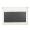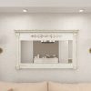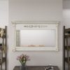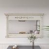 The purpose of a wall mirror, apart from home decoration, is to bounce back light to a small room to create the illusion of a bigger space. Specifically, this rectangle wall mirror complements narrow entryways, small antique and vintage-inspired bedrooms and living rooms, mantels, hallways, and transitional spaces between rooms. It also adds antiquated elegance with heavy distressing, intricate acanthus and antefix carvings at the top section, and an eggshell off-white color. This large mirror measures 59″L X 24″W X 36″H and hangs via triangle metal backings. Suitable for indoor use only. This item comes shipped in one carton.