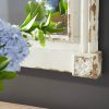 - This vintage mall mirror highlights a distressed eggshell white overall finish