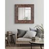 Capture the attention of family and guests alike with the bold Okeefe mirror from Kate and Laurel. Inspired by the casual yet sophisticated aesthetics of bohemian style, the Okeefe features a natural finish with intricate marquetry within its pieced wood. The Okeefe was handcrafted in India out of robust mango wood, giving each piece a distinct variation in graining and finish. The pieced wood tells a story of quality craftsmanship and attention to detail, giving it a delightful texture and romance in its display. The overall dimensions of this square mirror are 29 inches wide by 2 inches deep by 29 inches tall, making Okeefe a commanding focal point in any living room, bedroom, entryway, or dining room. Adding a mirror to your home makes any space appear larger and more vibrant by spreading your light sources. It looks fantastic on its own, or you could choose to hang it in multiples to create a grand, oversized wall display. Install the Okeefe with no hassle or stress thanks to the metal D-ring hangers attached to the back of the frame.