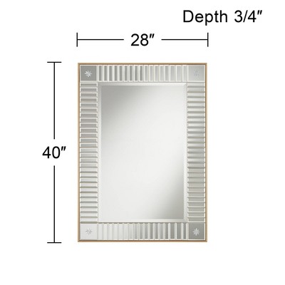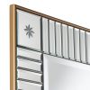 Put the final touches on a glam living area or bedroom with this rectangular wood wall mirror. It features a center beveled mirror surrounded by slender, beveled mirror tiles that create a frame with antique gold accents. Etched corners add a touch of detail and a fun emblem design. Hang vertically or horizontally to enhance your space.