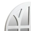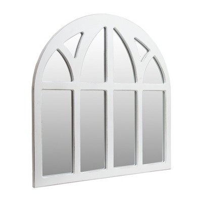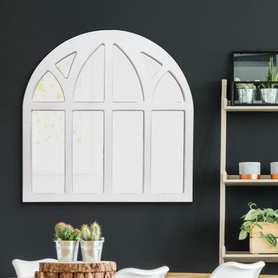 This gorgeous wall mirror brings character and elegance into any decor. Hand crafted from solid wood, this oversized mirror makes for a classic statement piece. Hang it securely on a wall with two industrial strength hangers on the back or lean it up against a wall above a mantel. Mirror measures 28 inches high x 28 inches wide x 0.7 inches deep. Frame is finished in an elegantly distressed white finish for a vintage feel and measures 1.5 inches wide. It’s cathedral inspired arched design will brighten any room and create the illusion of a larger space.