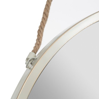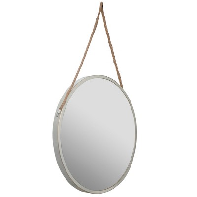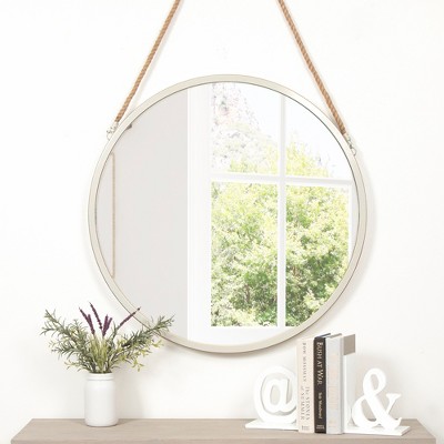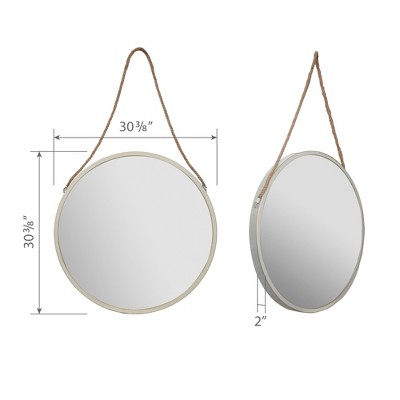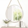 - This large round wall mirror lends clean, simple style with nautical inspired design like it’s jute rope hanging rope and porthole shape