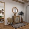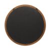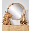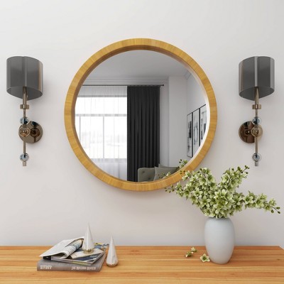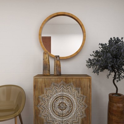 - This wall accent piece features a simple round vanity mirror with an elegant brown wooden frame