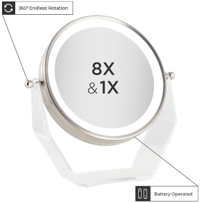 Zadro’s Two-Sided LED Lighted Acrylic Makeup Mirror is ideal for compact spaces that need bright lighting for perfect makeup application. Turn on the bright LED lighting to evenly illuminate your entire face, and enjoy the large 7 inch mirror reflection surface. Get ready in any room with a completely cordless design (4 AAA batteries required). One side is a full view 1X reflection thatβs ideal for everyday makeup and hairstyling, while the other side is a powerful 8X magnification to zoom in on every fine detail. Endlessly adjust the angle of the mirror head and effortlessly switch between magnifications so you can get ready even faster.