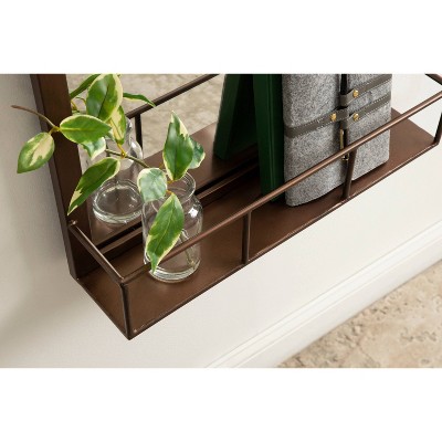 This striking wall mirror is a sophisticated addition to any room of your home. The Jackson wall mirror was inspired by modern design, utilizing a premium metal frame to give it a robust look and long-lasting resilience. This lovely mirror has a bronze finish that makes it an ultra-elegant statement piece that stands out in any decorative theme. Its overall dimensions are 20 inches wide by 4.75 inches deep by 30 inches tall, making it a striking focal point that commands attention in any room of your home. The Jackson also includes a small shelf attached to the bottom for small accent pieces, lotions, keys, and succulents! Adding a mirror like the Jackson to your home enhances your space by pulling in more light, thus making the space feel larger and more open. The Jackson mirror is perfect for hanging in your living room, bedroom, or entryway, providing a transitional look for any area. If you’re starting a bathroom renovation, this accent piece is fantastic for use as a modern vanity mirror! Hang the Jackson on any wall you see fit with metal keyhole hangers attached to the back of the metal frame.