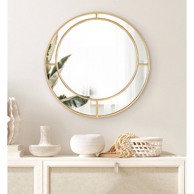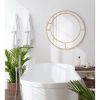 Create a commanding statement wall in your home with the decorative elegance of the Odaire wall mirror. Inspired by mid-century modern aesthetics, the Odaire features a beautiful gold leaf finish and a trendy round shape. However, the element of the Odaire that captures the imagination is the decorative inlay over the glass. This inlay is a circular shape interconnected with four clean lines attaching to the round frame. This gives it a look inspired by concentric circles, drawing the eye to the mirror’s center. The frame and inlay were composed of a high-quality blend of wooden materials, making it lightweight yet resilient. It’s a perfect accent to create a focal point in any entryway, living room, or bedroom. The 24-inch diameter also makes it a fantastic mirror to place above your bathroom vanity. The avant-garde design is excellent for showcasing your mid-century modern style while adding vibrancy and dimension to your favorite space. Installing the Odaire takes a matter of seconds with the metal D-ring hangers attached to the back, providing a quick and easy mounting to showcase your decor style in no time flat.