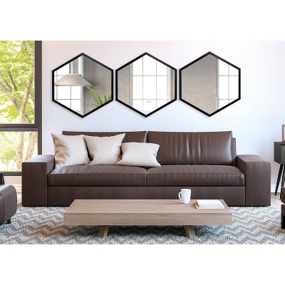 Add an element of light and dimension to your home with the Laverty modern mirror. The hexagon shape and black frame create an industrial design capable of thriving in any living space. Adding a mirror to your home decor opens up narrower spaces by reflecting light sources and spreading them across the room. The Laverty mirror stands at 24 inches by 26 inches, making it an excellent medium-sized mirror to use as an industrial double vanity in your master bathroom. Create a makeup and styling area in your bedroom, or hang it over a console table in your entryway. It only takes a matter of seconds to mount thanks to its lightweight frame and metal D-ring hangers pre-installed on the back. No matter how you choose to display this mirror, it’s sure to dazzle all of your guests with its clean, modern design and trendy geometric shape.